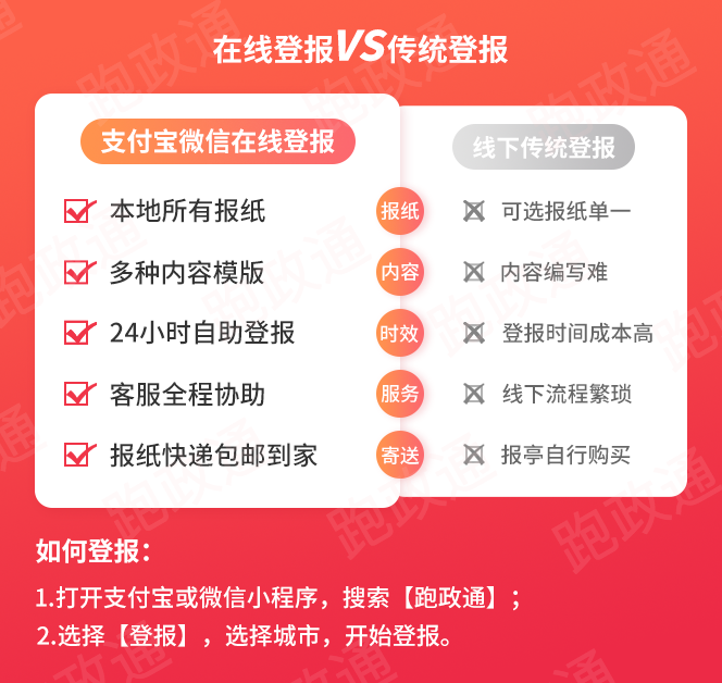 公告声明是安徽商报的广告业务之一,登报的类型有还有遗失声明等等。登报有线下办理和互联网办理登报两种,互联网办理以互联网技术为依托构建登报平台,通过互联网办理各类业务,体验便捷,不受时间的影响,非工作日也可以正常提交登报信息。